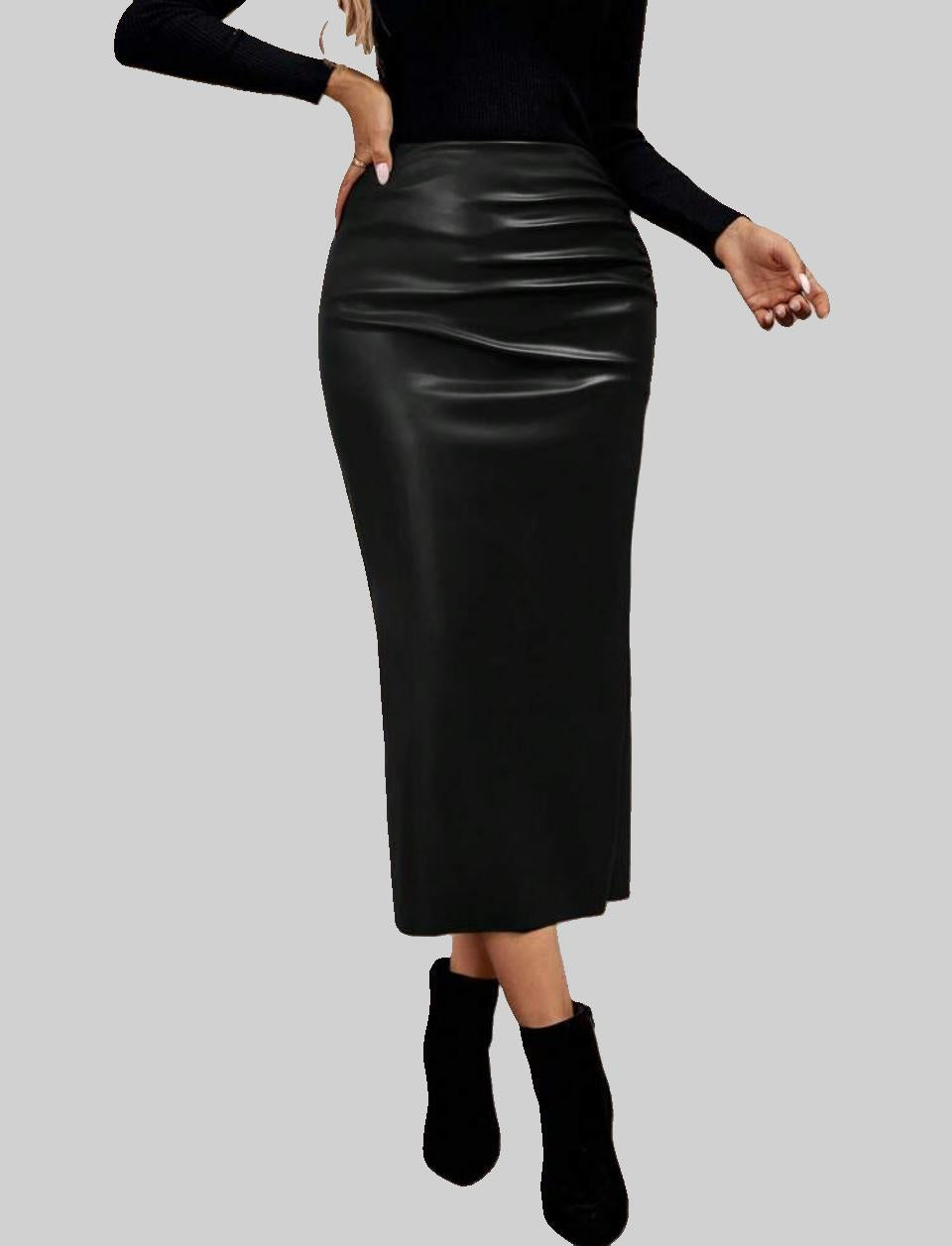 Styling Tips: Pair this skirt with a crisp white blouse and heels for a polished office look or dress it down with a graphic tee and sneakers for a trendy, casual ensemble. Whether you're heading to a meeting or a night out, the Black Faux Midi Skirt is your go-to for effortless style.
